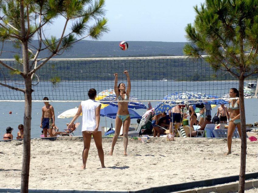 oddalona o ok. 100 m, żwirowo-kamienista. Leżaki i parasole (odpłatnie / ograniczona liczba).